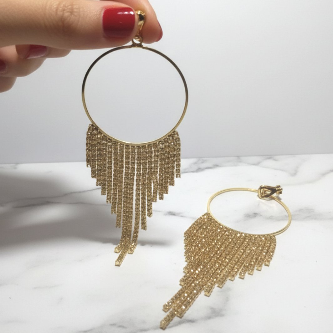 Maxi brinco de Pressão Dourado de Festa com Franja de Strass Deia
