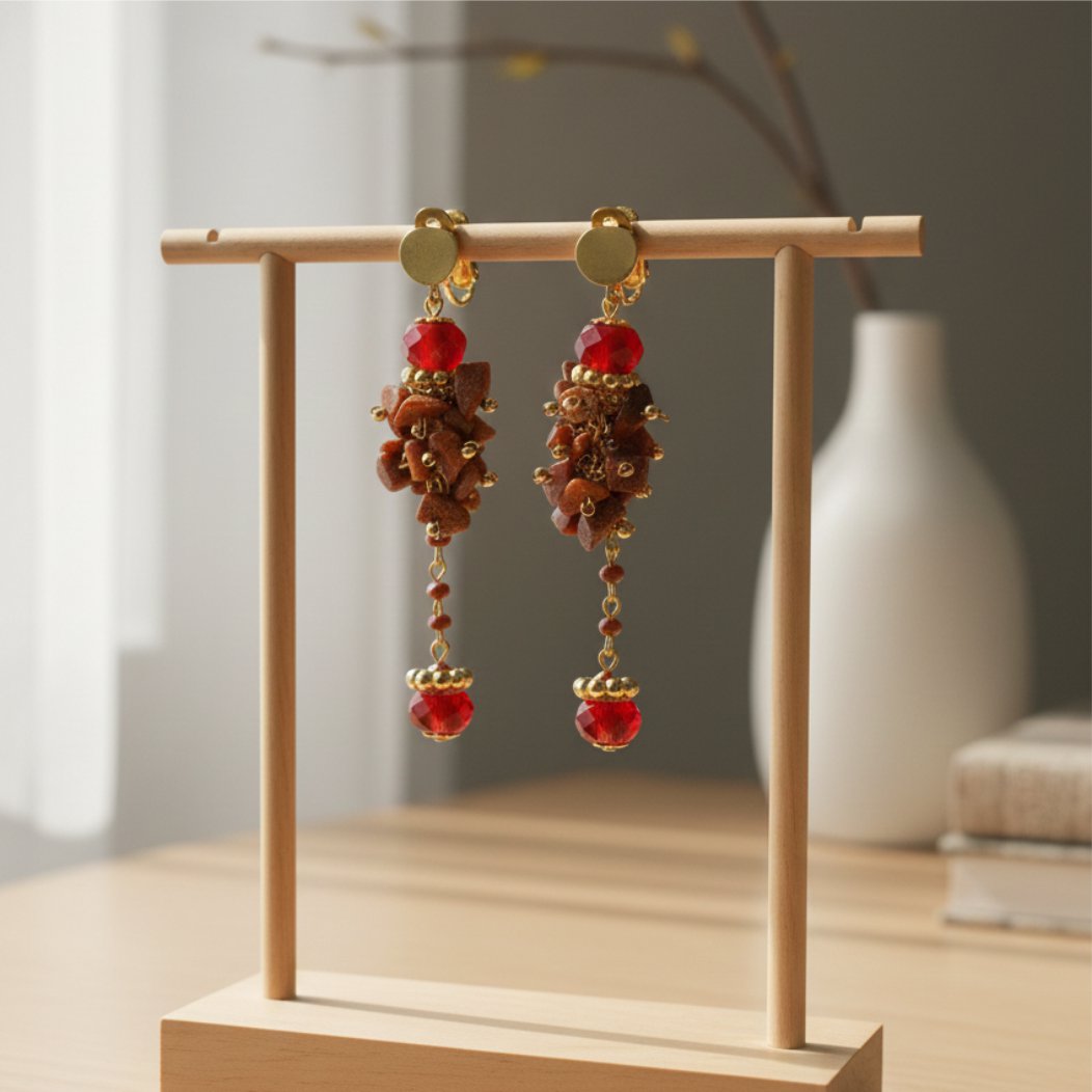 Material: pedra marrom cascalho de resina com brilho, metal, e cristal vermelho