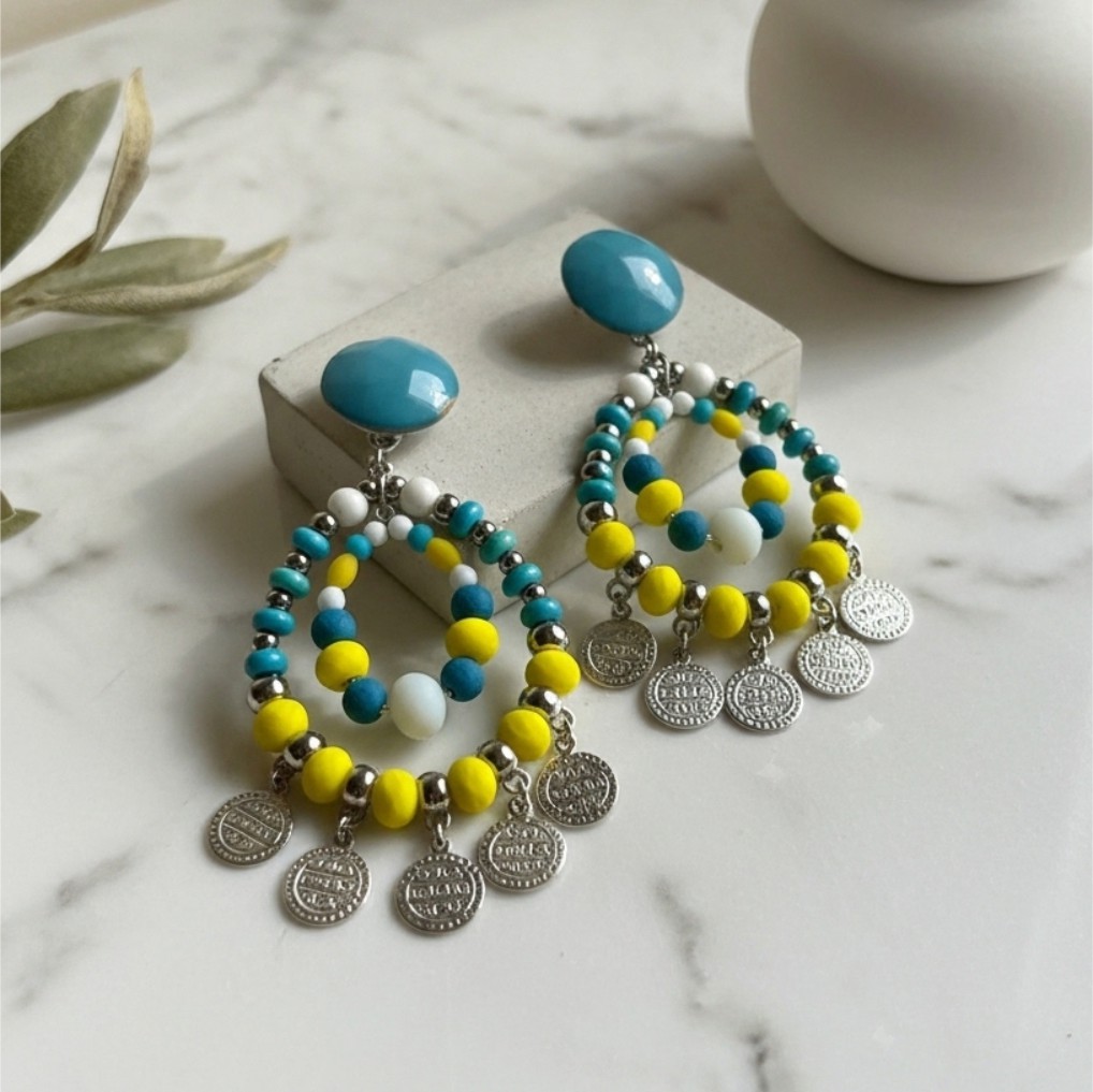 Brinco de Pressão Turquesa e Amarelo Grande Boho Chic com Moedas Prata Alice