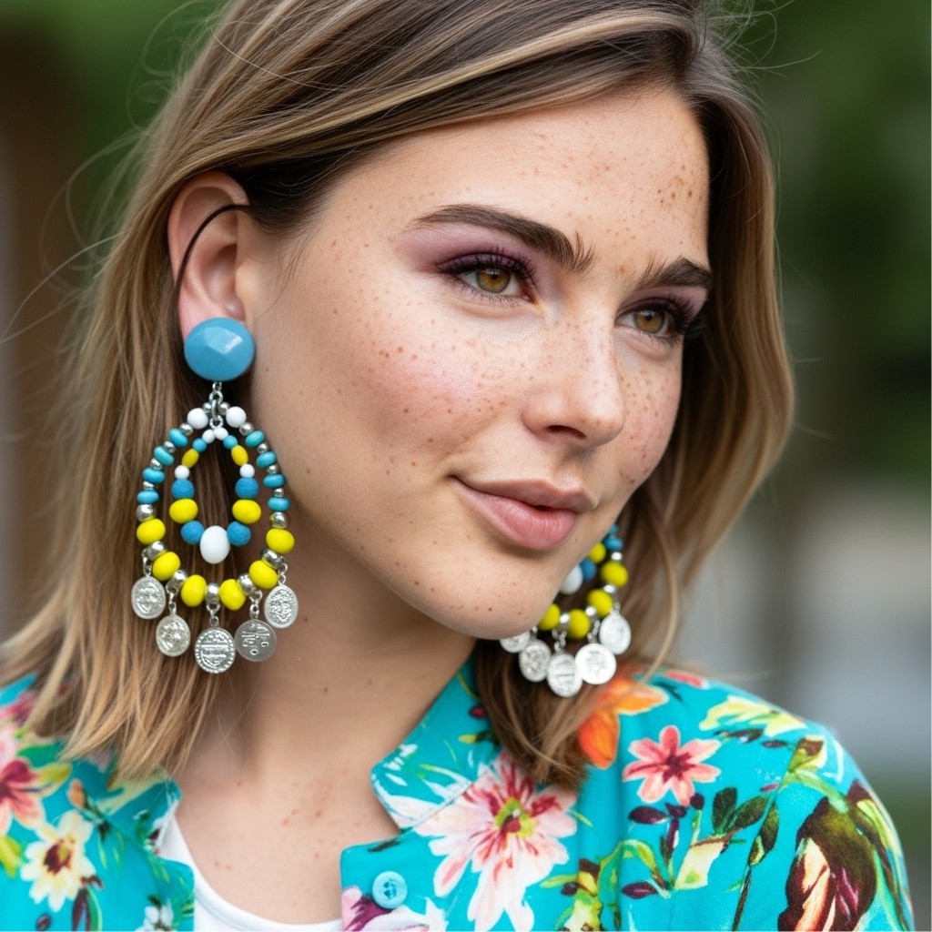 O brinco de pressão turquesa e amarelo grande Boho Chic com moedas prata Alice é o acessório perfeito para quem busca adicionar estilo e personalidade ao look com confiança. Com um design que combina elementos boho chic e hippie chic, este brinco destaca-se pela sua vibrante combinação de cores e volumes. O amarelo e o turquesa se unem em harmonia, criando uma peça única e cheia de personalidade.
