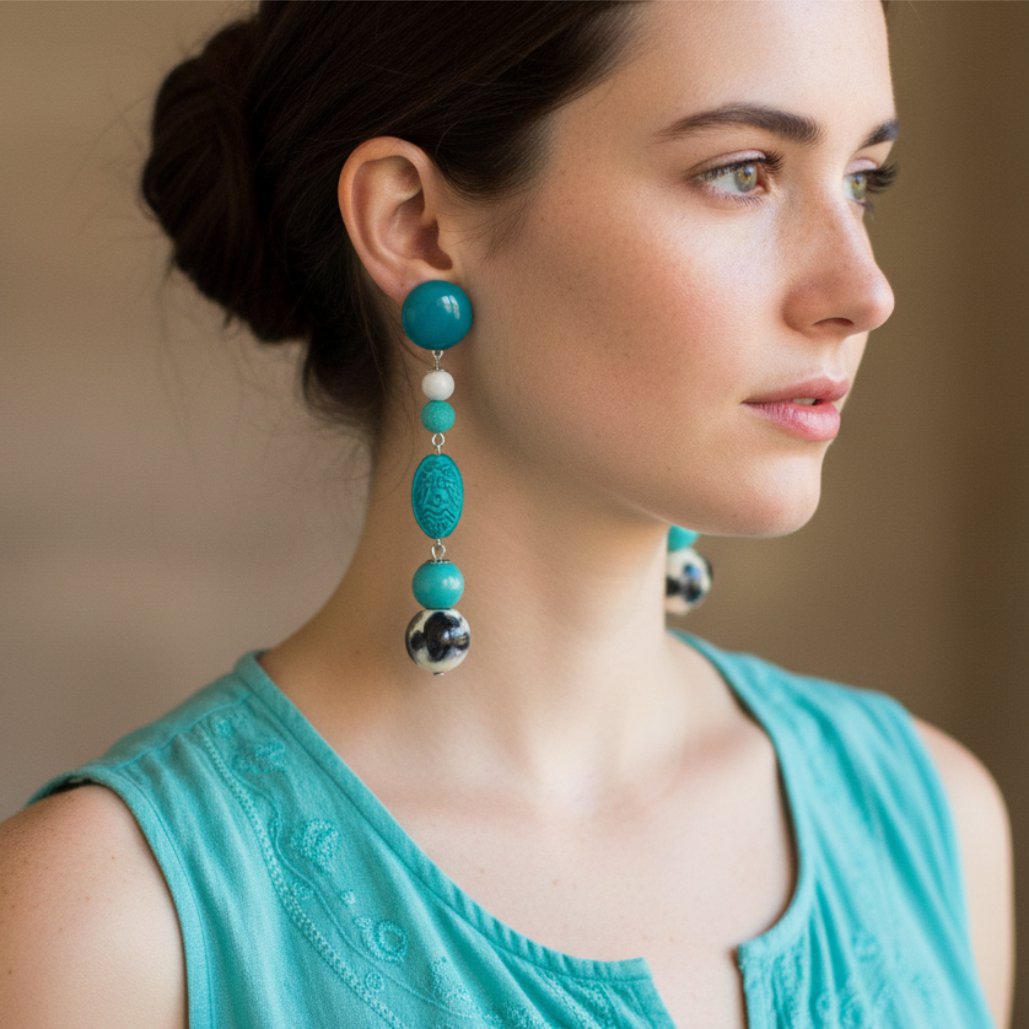 Ir à lojaBrinco de Pressão Turquesa e Preto Longo Boho Chic