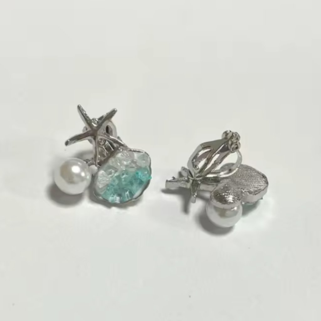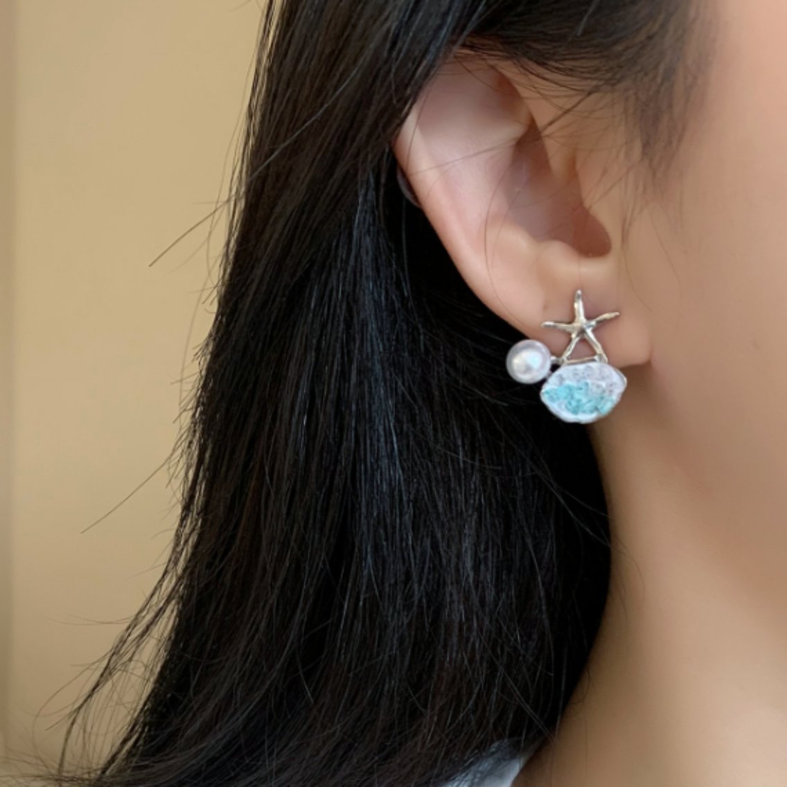 Brinco de pressão estrela do mar e concha prata moda praia Arielle